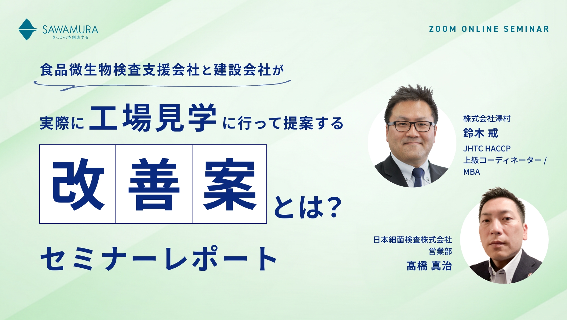本セミナーでは、食品微生物検査の専門家である日本細菌検査株式会社・高橋部長と、食品工場の建設・改修を多く手がける澤村の鈴木が登壇。実際の工場見学事例で挙がった課題に対し、「運用(ソフト)」と「建設・設備(ハード)」の両面から、具体的な改善策を徹底解説しました。